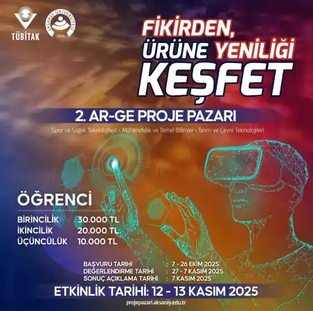 12-13 Kasım 2025 tarihinde gerçekleştirilecek olan Aksaray Üniversitesi 2. AR-GE Proje Pazarı etkinliğine ilişkin afiş aşağıda sunulmuştur.