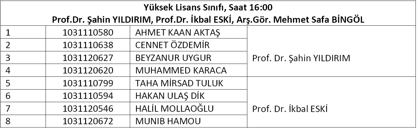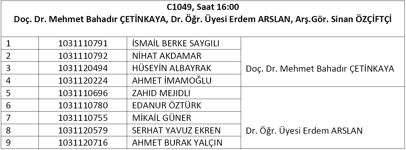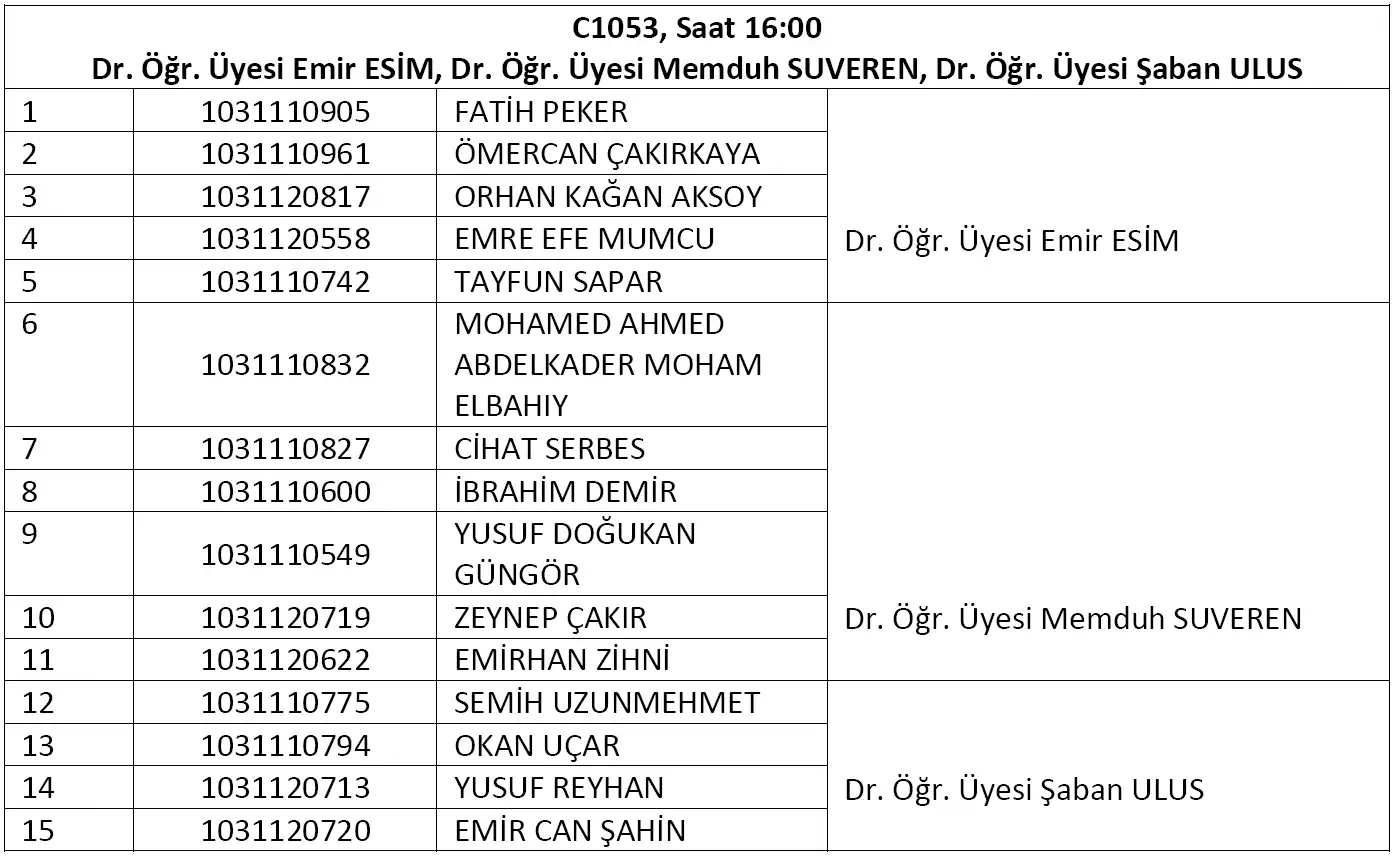 Bitirme Sunum Listeleri (15.01.2026 Perşembe Günü Saat:16.00)