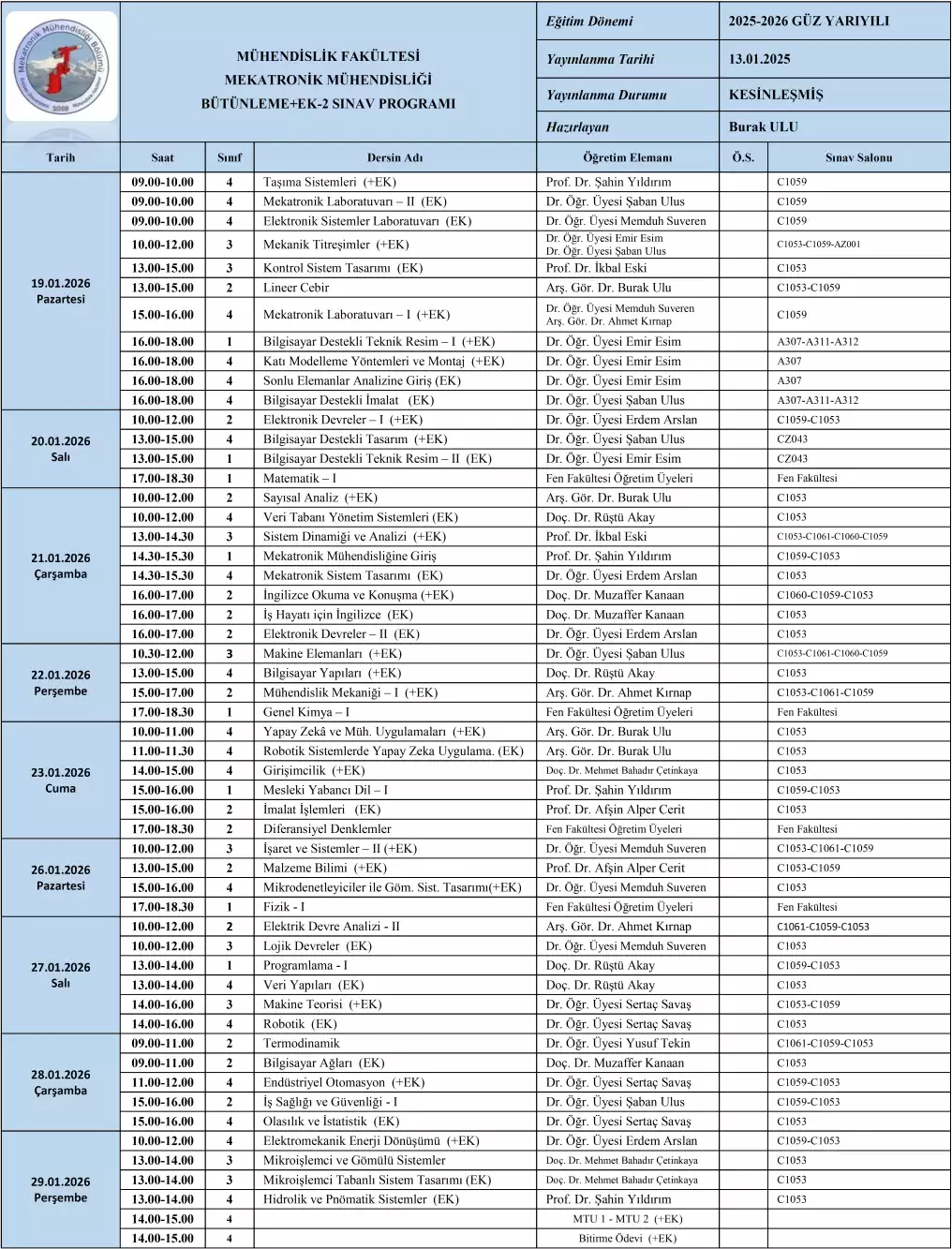 Kesinleşmiş Bütünleme ve Ek-2 Programı