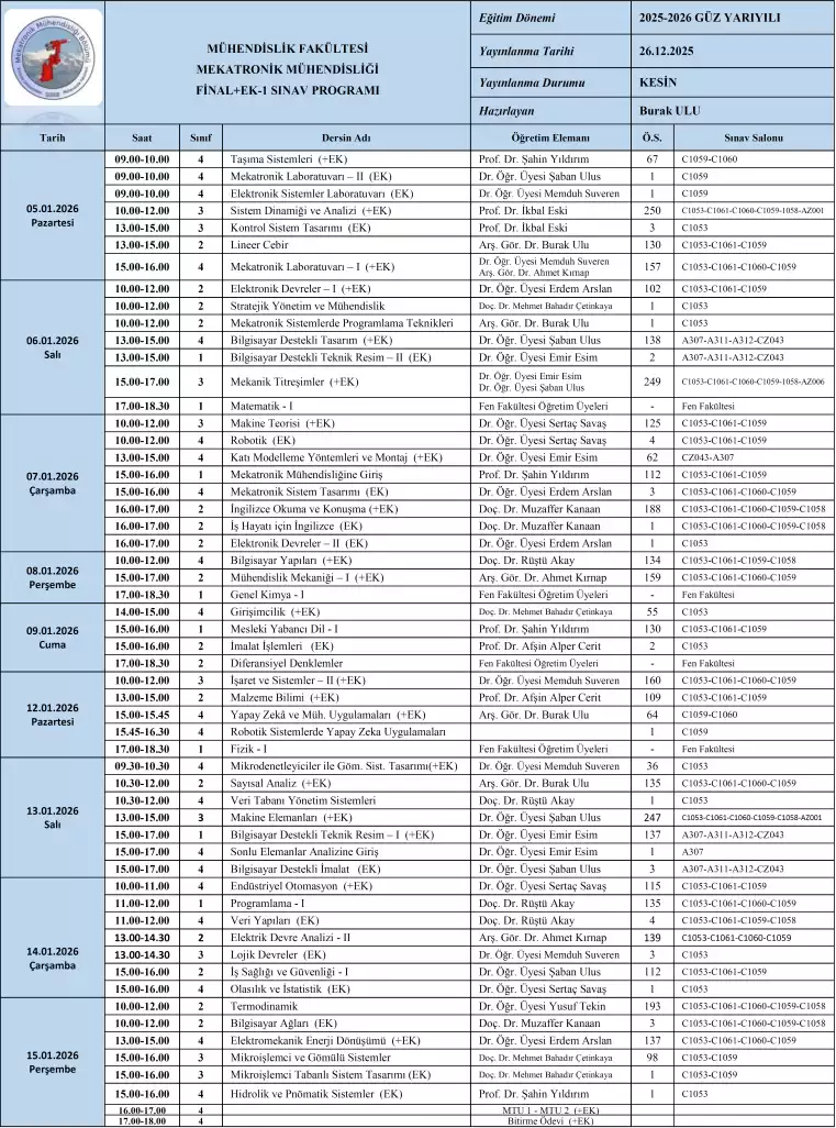 Ek-1 sınavına girecek öğrenciler, 'sadece sınav saati çakışması' durumunda 29.12.2025 saat 12:00'ye kadar itirazlarını iletebilirler.