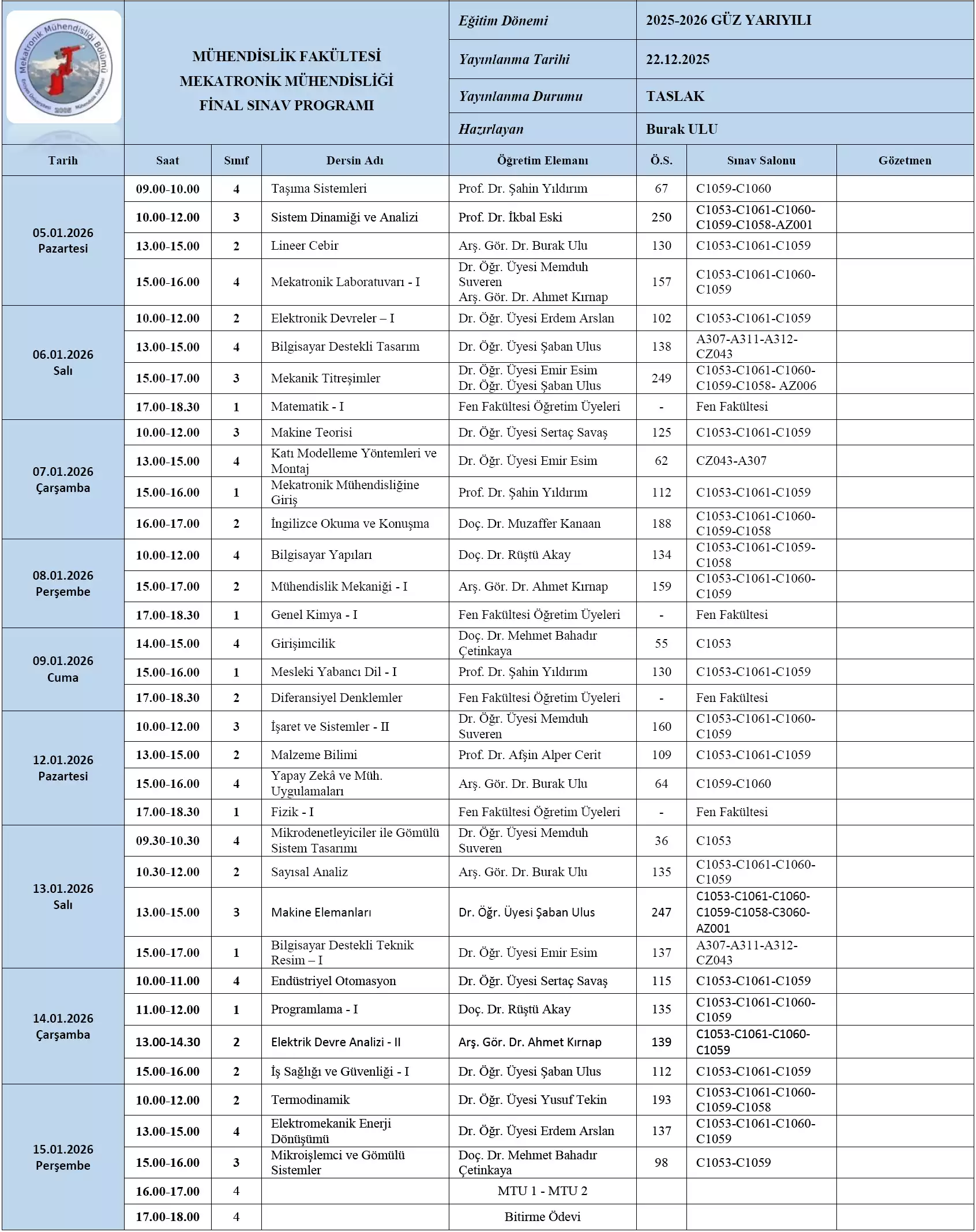 İtirazlar sadece çakışma durumunda Arş. Gör. Dr. Burak ULU'ya 22.12.2025 saat:15:00'a kadar yapılabilir.