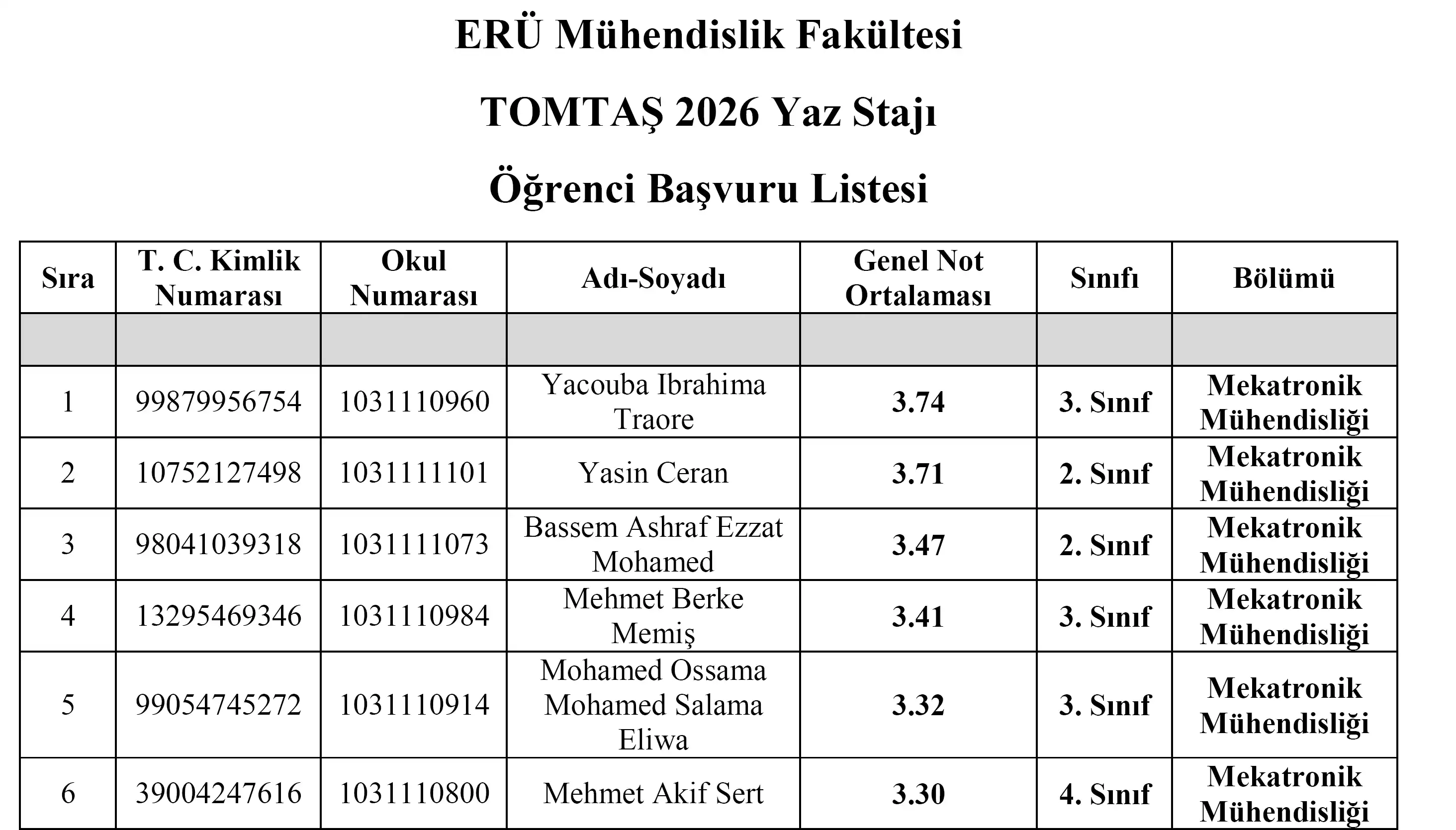TOMTAŞ stajı için mülakata çağrılan öğrencilerimizin listesi EK dosyadaki gibidir.